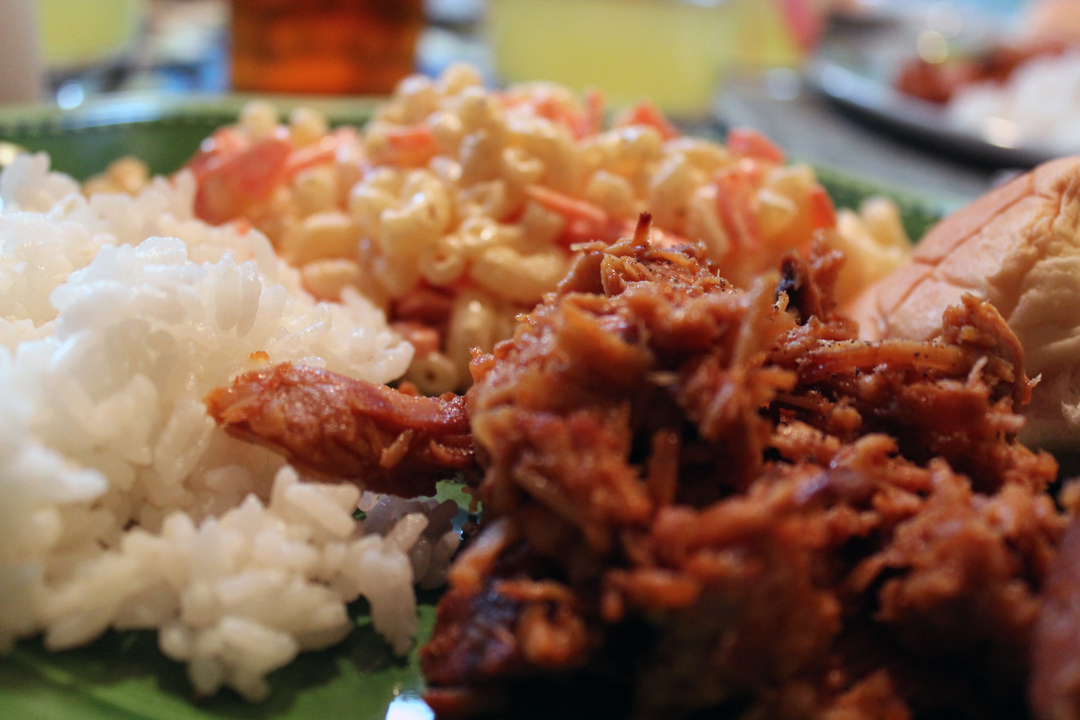 I leapt into action and the resulting meal appears above; it was a Carolina take on Hawaiian plate lunch. (Side note: if you have never seen Sarah Vowell’s short meditation on the history of plate lunch, go check it out. Right. Now.) Yes, the expected sticky rice and mayonnaise-laden macaroni salad took up residence on our table. Pig was also featured, but instead of the usual kalua pig I substituted pulled pork BBQ in a tangy Western Carolina-style sauce. I thought about finishing the meal with hush puppies, but King’s Hawaiian sweet rolls won the day.